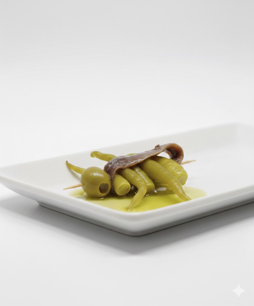Anchovies marinated in vinegar for 3 to 4 hours and then soaked in oil. Served on crostini covered with very spicy red and green pepper. A tasty bite that you won’t be able to say no to.